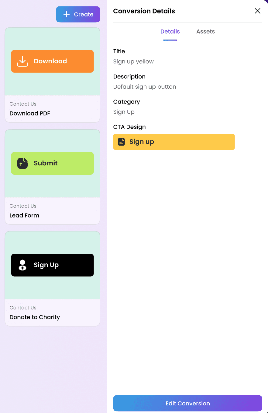 Go to the Conversions tab and select the conversion you want to update. In the Conversion Details side panel, click Edit Conversion.