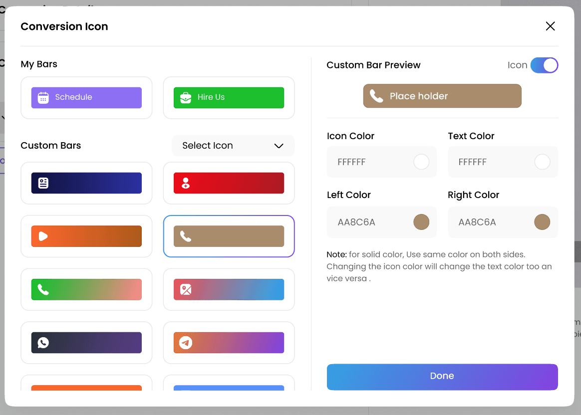 Click the dropdown under Call to Action Design to adjust the icon, text, and background color to match your theme. When ready, click Done to save your design changes and close the popup.