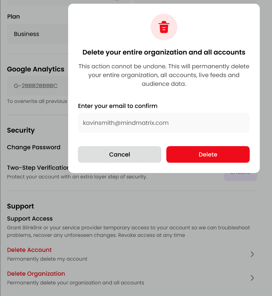 Your entire organization, all accounts, live Feeds, and Audience data will be permanently deleted.