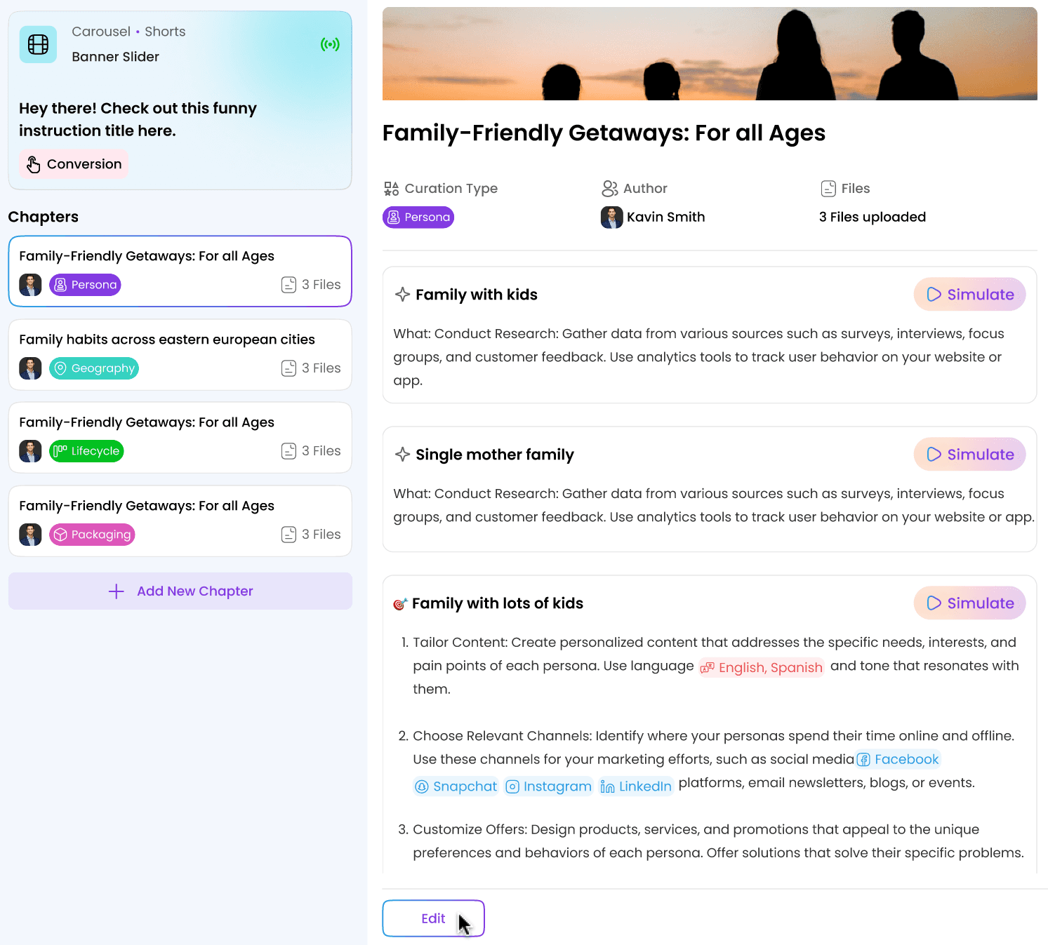 Modify a Curation’s Chapters, sections within a chapter, purpose, or the connected Feed.