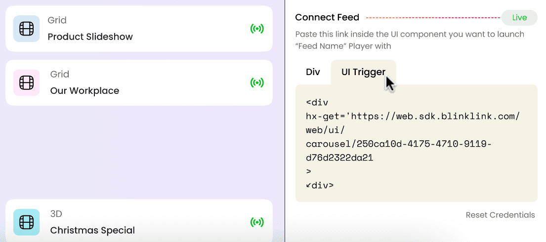 Copy the UI Trigger div code and paste it into the UI component you want to use to launch the Feed Player.