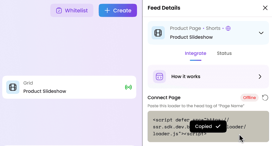 In the Feed Details side panel under Connect Page, locate the Javascript snippet and click to copy it.