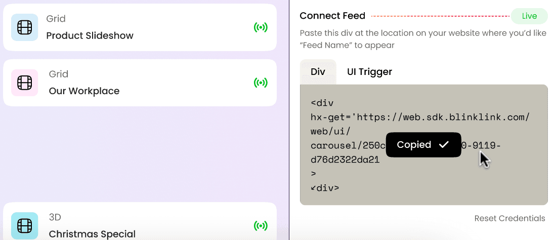 In the Feed Details side panel under Connect Feed, locate the div code and click to copy it.