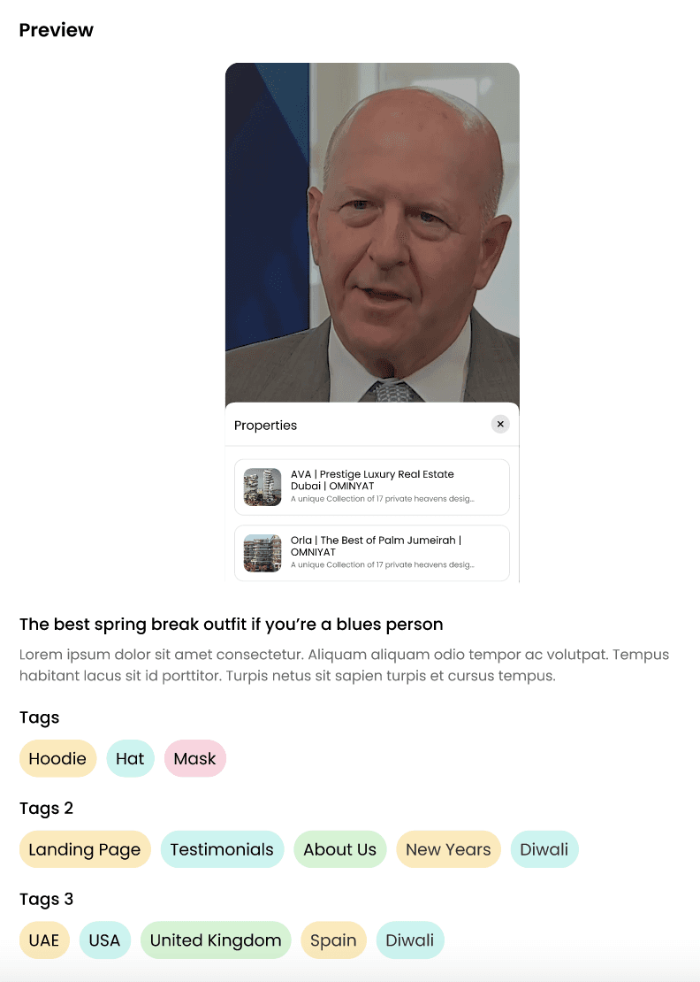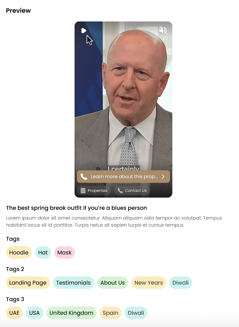 After uploading your content, a preview will appear on the side of your screen. This preview updates in real-time as you make changes, such as adding Tags or Conversions.