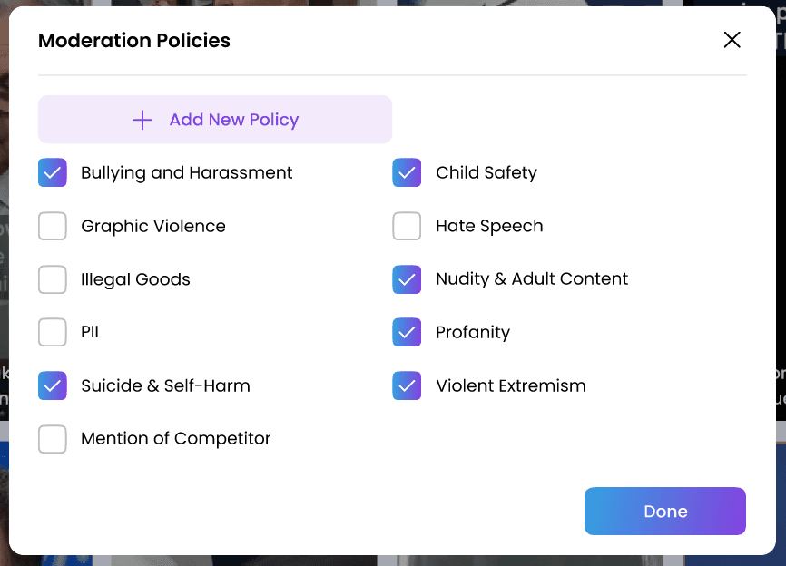 To review moderation policies navigate to the Uploads tab and click Moderation Policies. A popup displays existing and custom policies. Select or deselect policies by checking or unchecking the appropriate boxes.