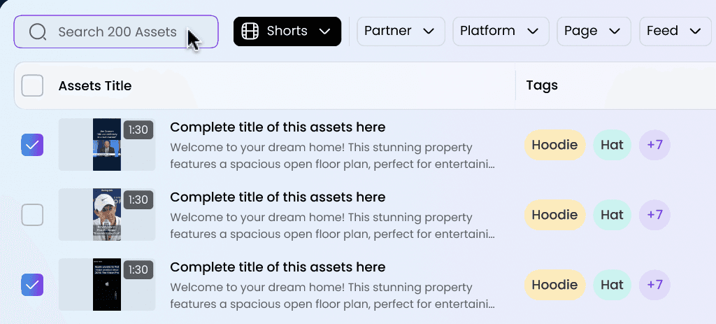Quickly locate Assets by typing a name or keyword into the search bar at the top of the Assets tab. Results matching your query will appear instantly.