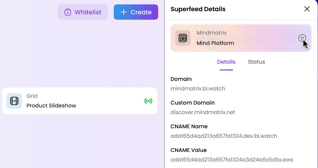 In the Superfeed Details side panel click the settings icon next to the Superfeed’s name.