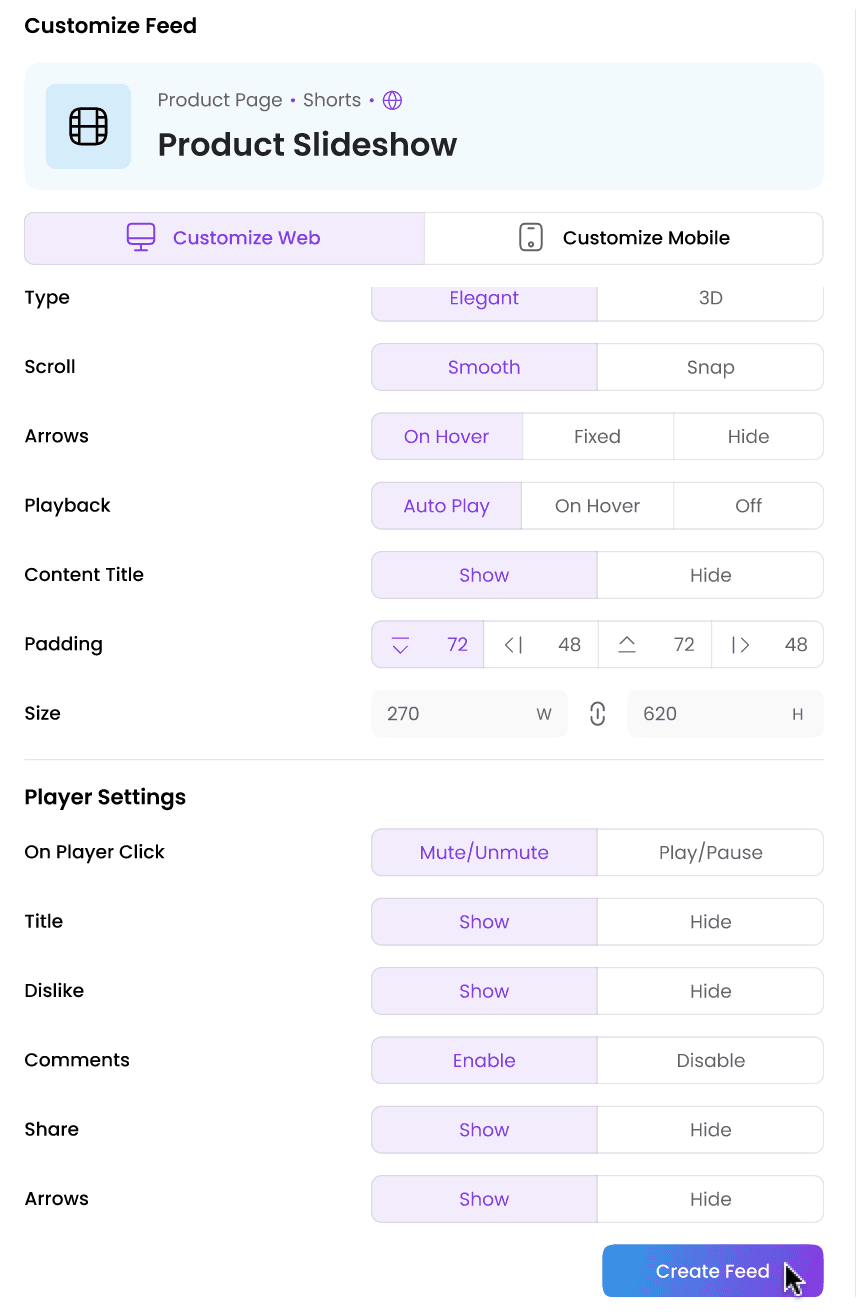 Click Continue to access customization options for the Feed. Update the Preview and Player settings as needed. Once all changes are complete, click Create Feed to finalize your updates.