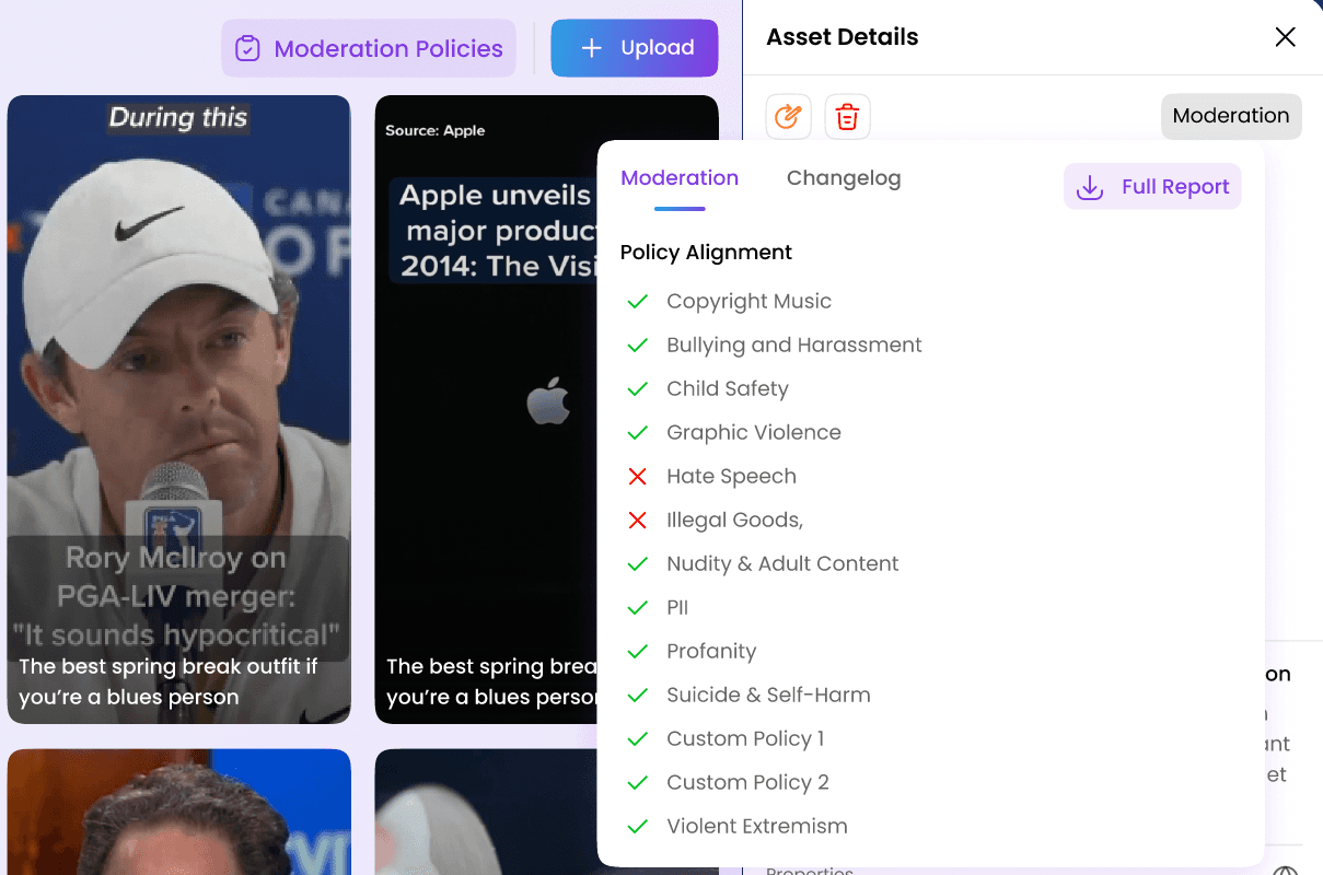 Every upload is checked against your moderation policies. The details of this check are available in the Asset’s Moderation Details section.