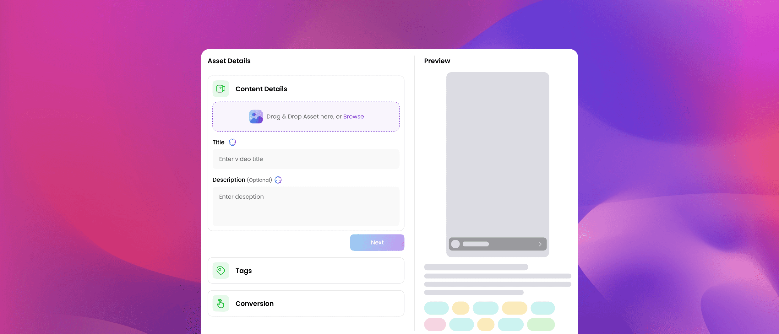 Revamped upload asset screen with adjusted container heights, paddings, and thumbnail previews.